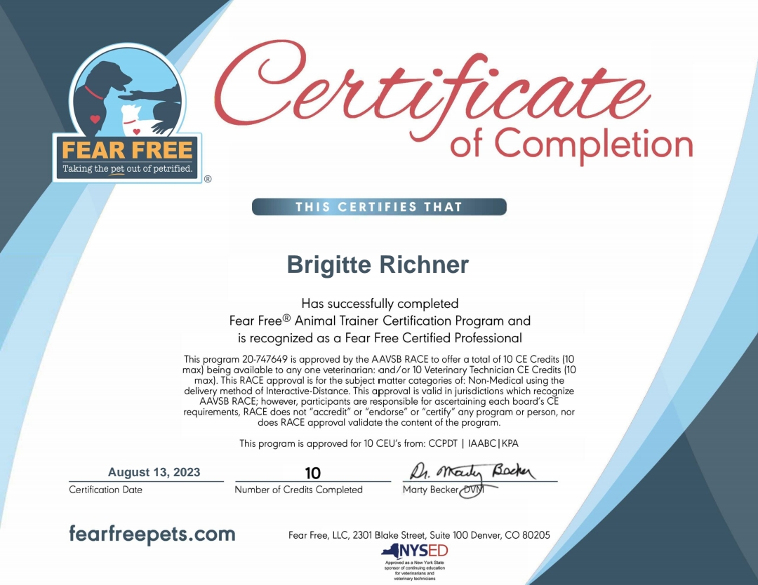 12.2022 bis 08.2023: Fear Free Animal Trainer Certification Program